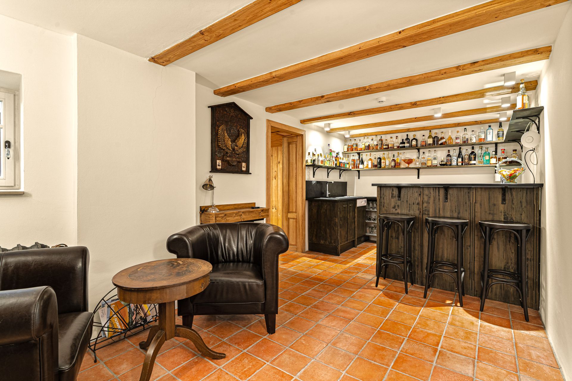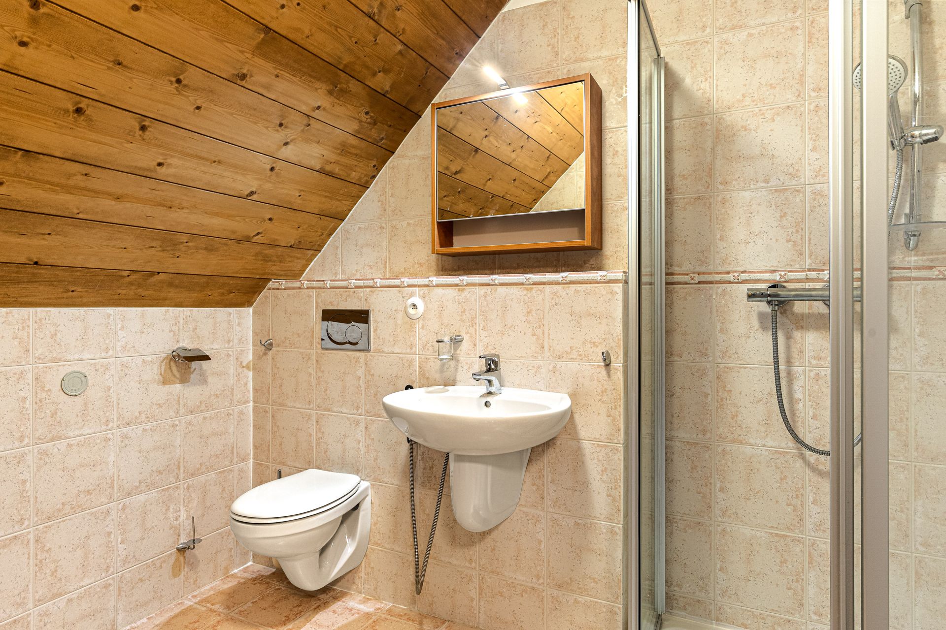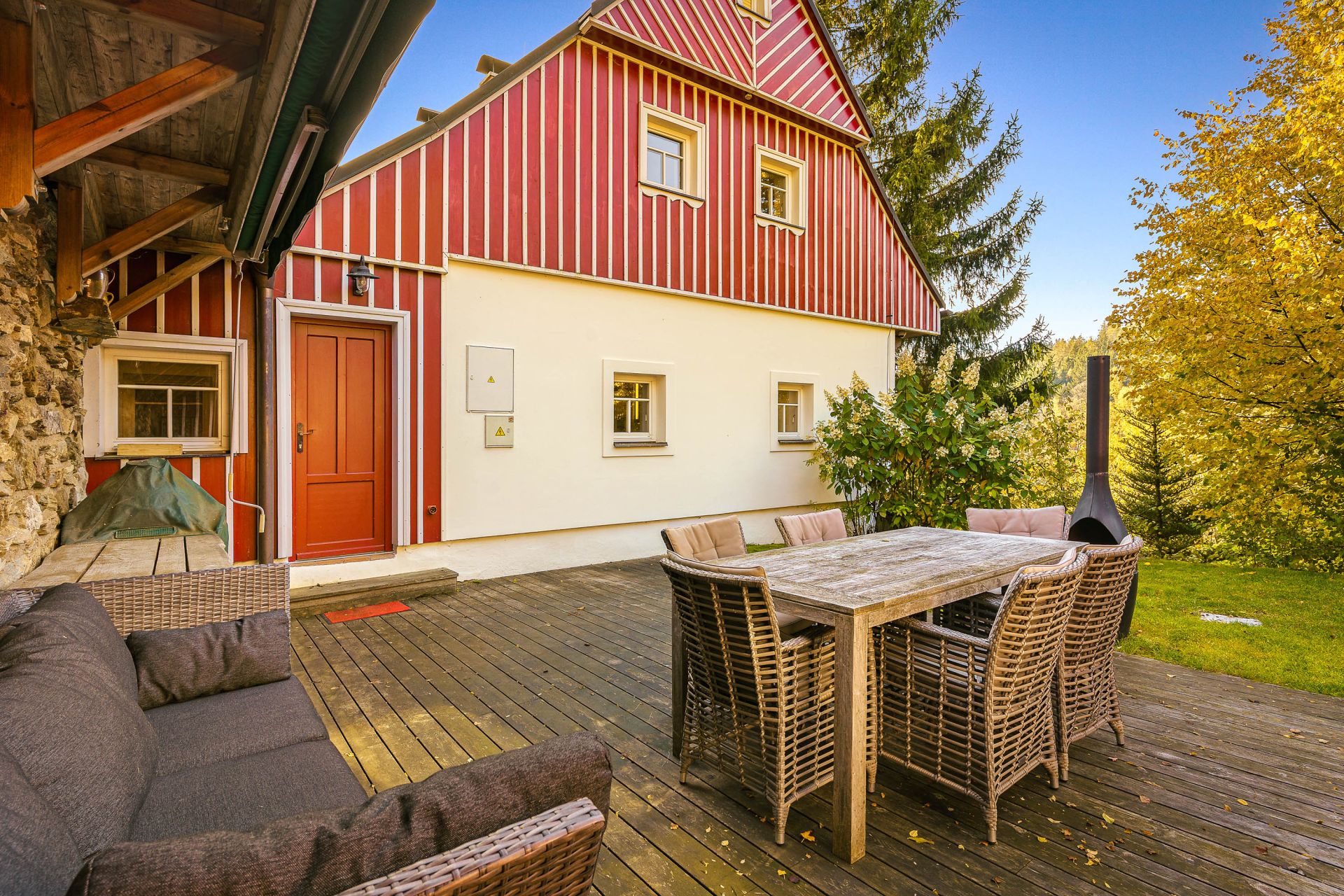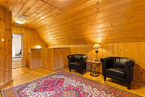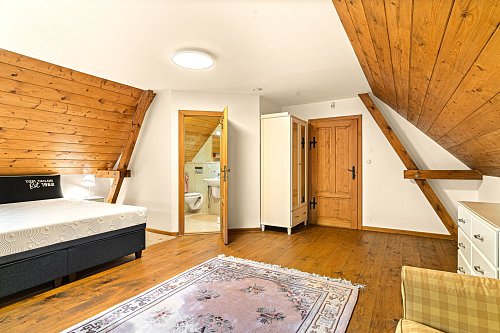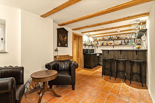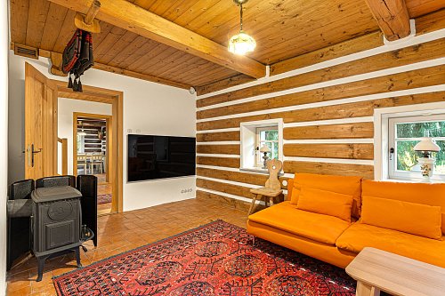V přízemí se nachází prostorná, do detailu vybavená obytná kuchyně s jídelnou, ideální pro velké rodinné setkání či přátelské posezení. Atmosféru dotváří krásná kachlová kamna a stylová replika místních stojacích hodin s původním strojkem. Součástí přízemí je i odpočinková místnost, využitelná i jako ložnice s vlastní koupelnou vybavenou špičkovou saunou KLAFS (finská sauna, saunarium, infrasauna) a parní sprchou KERAMAG AURA. Samozřejmostí je i samostatné WC. V zadní části domu se nachází moderní kotelna a původní kamenný sklep s celoroční stálou teplotou. Dispozici přízemí dále tvoří místnost s výjimečným atraktivním prvkem - přiznanou skalní stěnou, po níž jemně stékají pramínky vody. Další místnost, která je vybavená barem a elektrickým krbem zn. ELEMENT, tvoří společenskou část chalupy a navazuje na ní kinosál vybavený technikou B&W. Z této místnosti je vstup na spodní venkovní terasu. Nad tímto křídlem se nacházejí dvě ložnice s vlastní koupelnou a jedna je se vstupem na druhou vyvýšenou venkovní terasu, která je vybavená stylovým nábytkem EcoFurn, Solo Stove.
