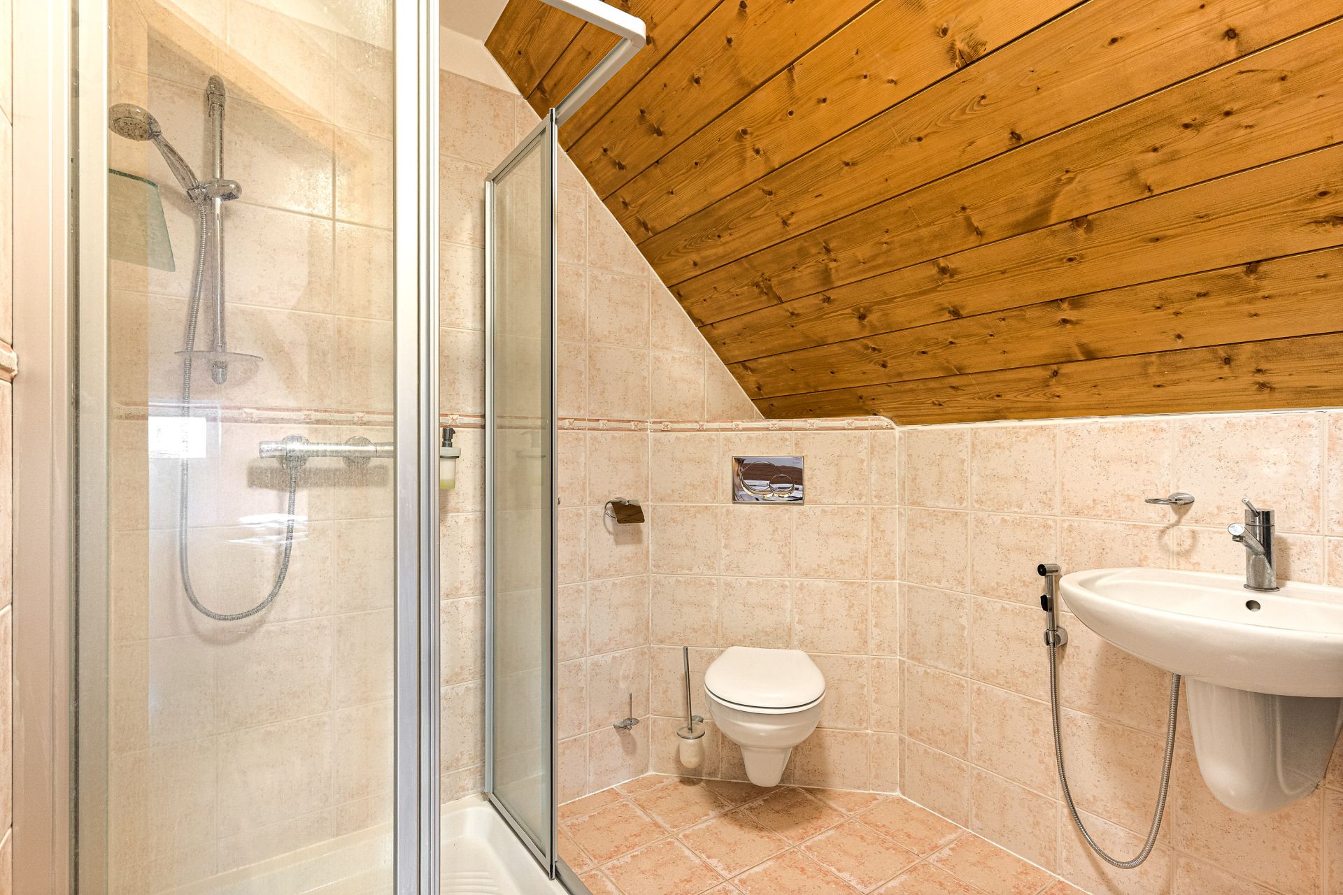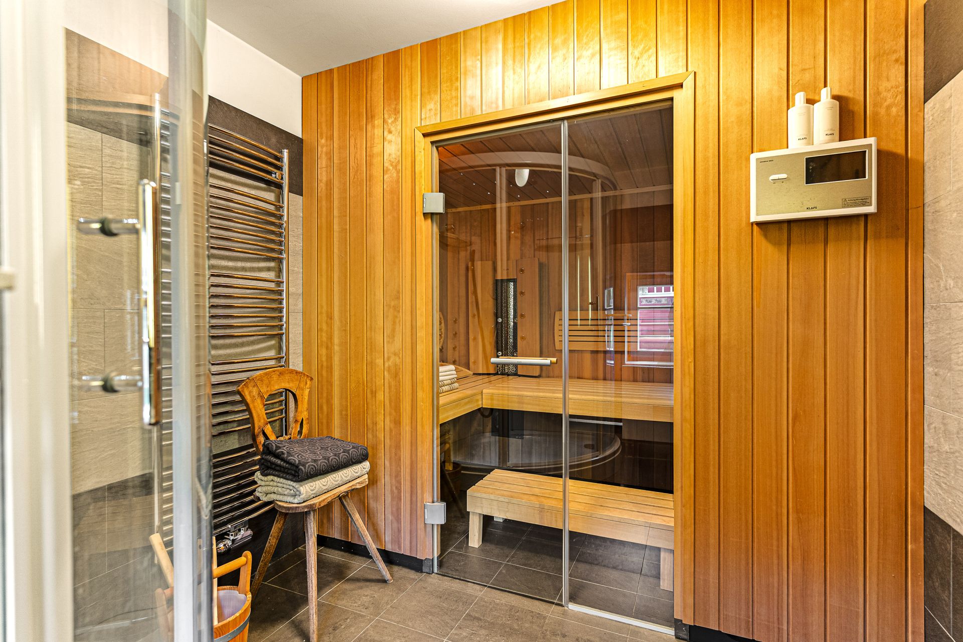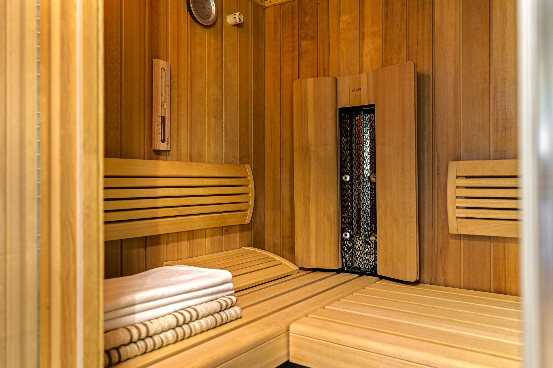 V přízemí se nachází prostorná, do detailu vybavená obytná kuchyně s jídelnou, ideální pro velké rodinné setkání či přátelské posezení. Atmosféru dotváří krásná kachlová kamna a stylová replika místních stojacích hodin s původním strojkem. Součástí přízemí je i odpočinková místnost, využitelná i jako ložnice s vlastní koupelnou vybavenou špičkovou saunou KLAFS (finská sauna, saunarium, infrasauna) a parní sprchou KERAMAG AURA. Samozřejmostí je i samostatné WC. V zadní části domu se nachází moderní kotelna a původní kamenný sklep s celoroční stálou teplotou. Dispozici přízemí dále tvoří místnost s výjimečným atraktivním prvkem - přiznanou skalní stěnou, po níž jemně stékají pramínky vody. Další místnost, která je vybavená barem a elektrickým krbem zn. ELEMENT, tvoří společenskou část chalupy a navazuje na ní kinosál vybavený technikou B&W. Z této místnosti je vstup na spodní venkovní terasu. Nad tímto křídlem se nacházejí dvě ložnice s vlastní koupelnou a jedna je se vstupem na druhou vyvýšenou venkovní terasu, která je vybavená stylovým nábytkem EcoFurn, Solo Stove.