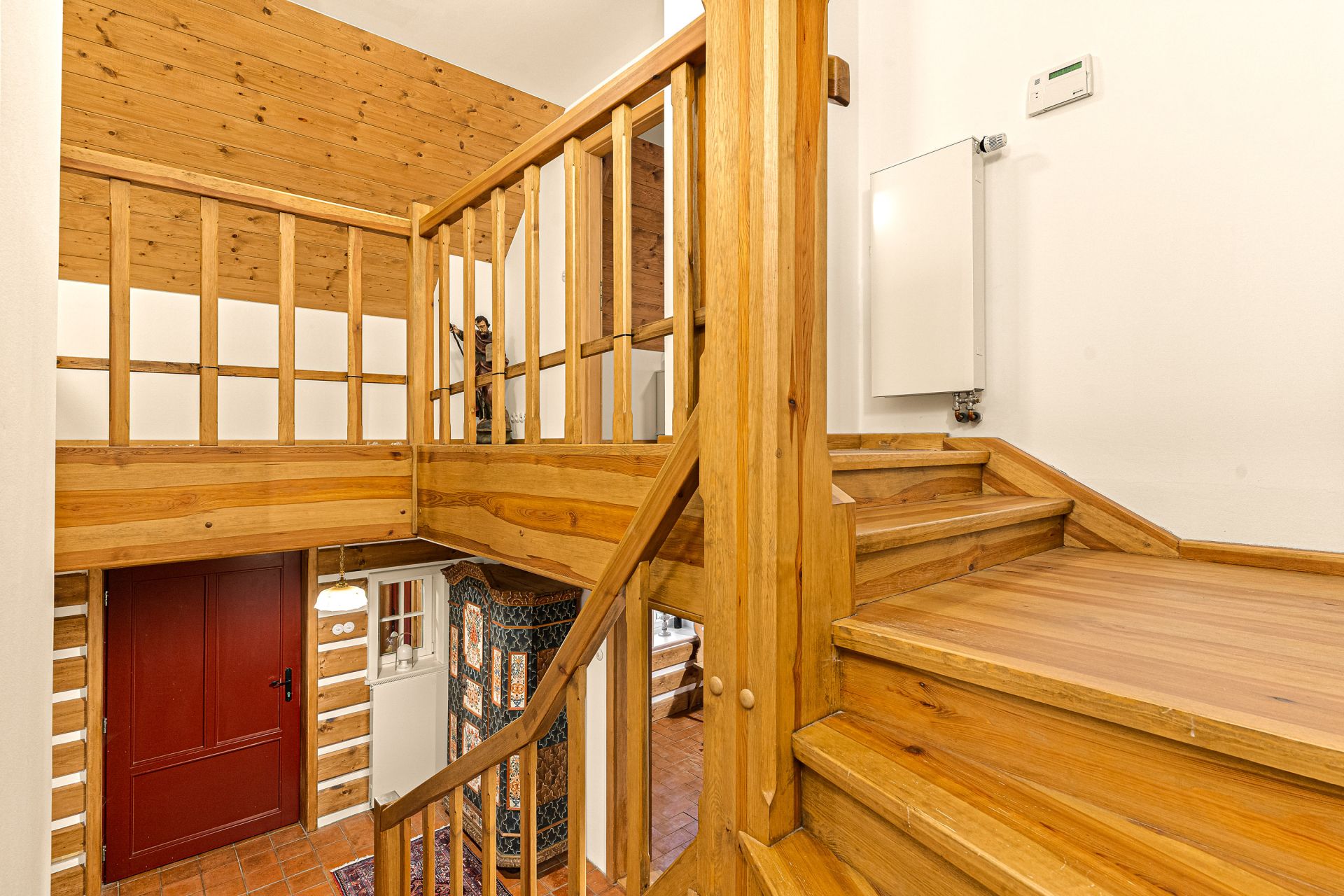 Dominantou hlavní chodby chalupy je masivní dubové schodiště, v patře nad hlavní částí chalupy se nacházejí tři samostatné ložnice s vlastní koupenou (sprchový kout, umyvadlo, WC). Dispozice chalupy tímto zajišťuje dostatek soukromí pro vícečlennou rodinu nebo početnější návštěvu.