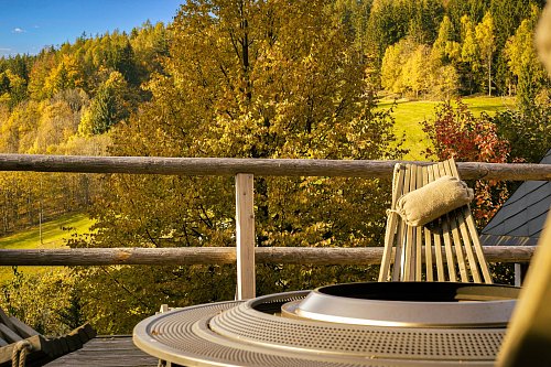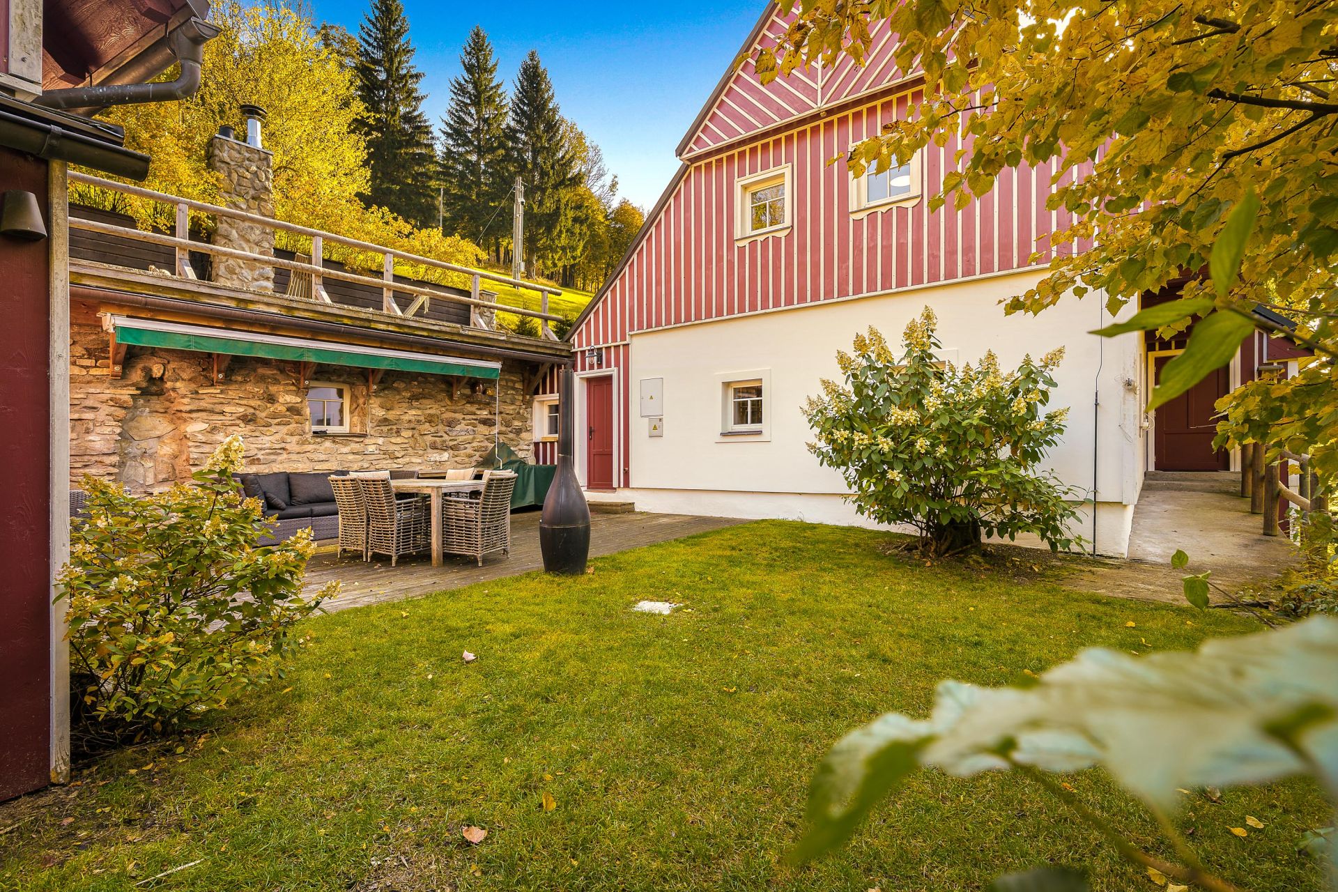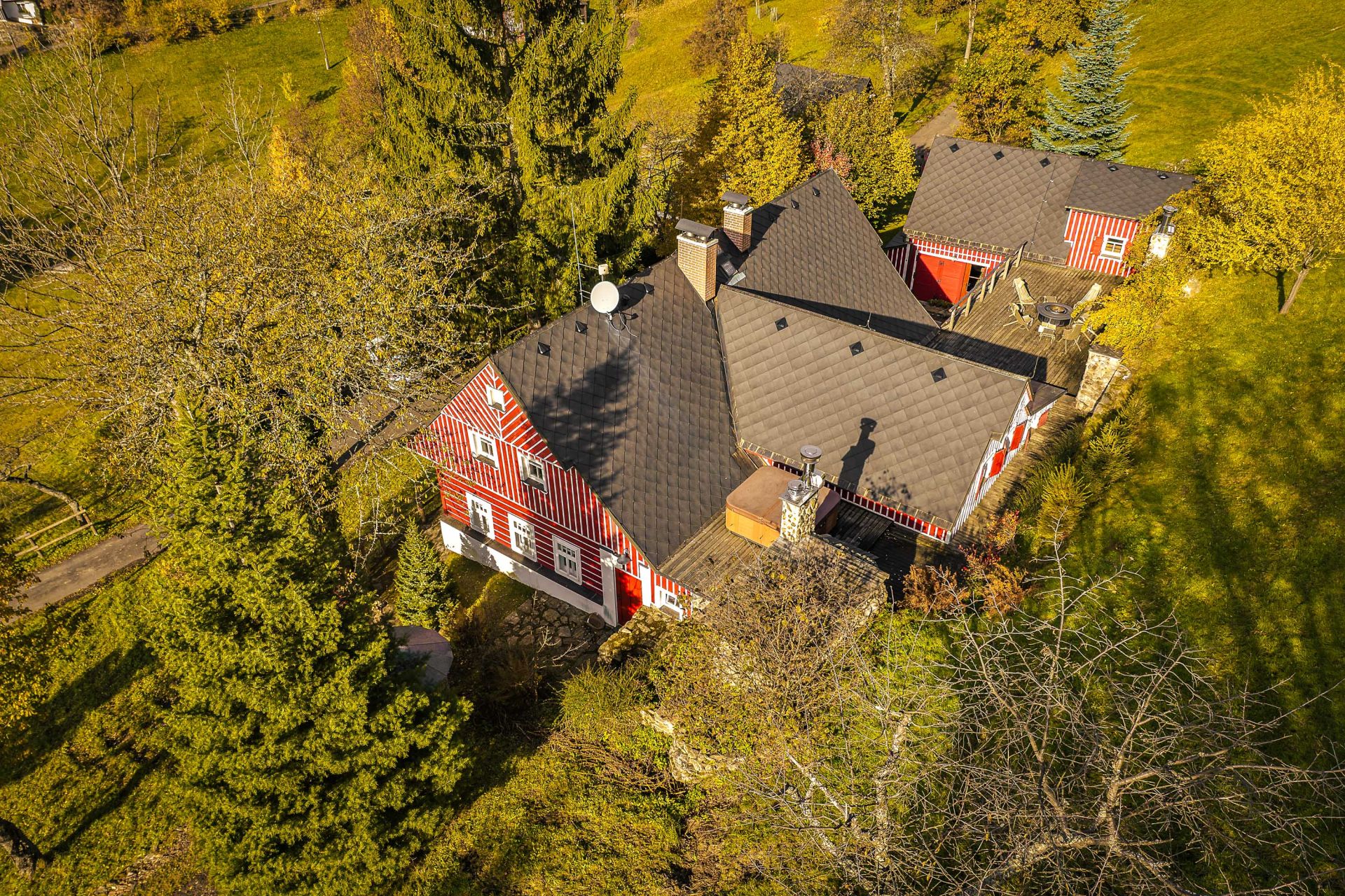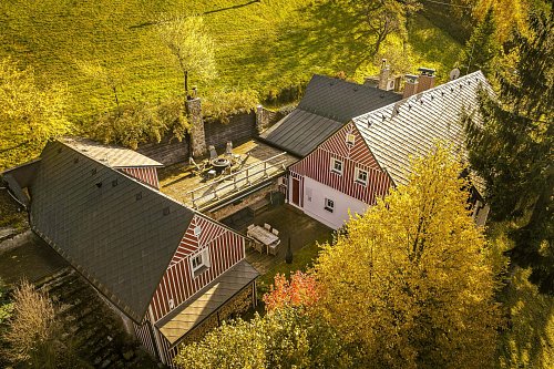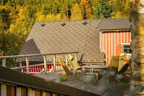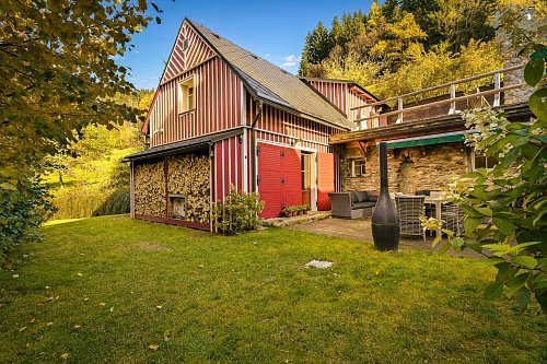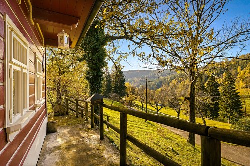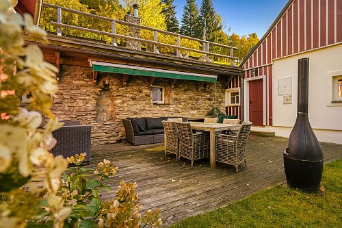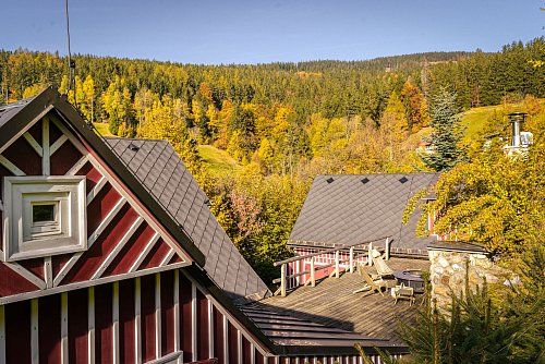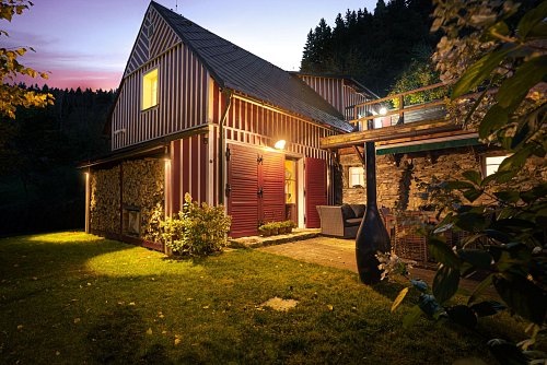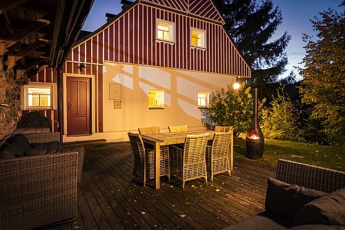 U domu se nacházejí tři venkovní terasy, hlavní je s venkovním krbem, v patře je terasa s ohništěm a třetí relaxační terasa je s venkovní vířivkou HotSpring. Součástí je garáž a soukromé parkování pro 4 vozy. Chalupu obklopuje rozsáhlý pozemek o velikosti 27.504m2, jedná se o jedno z nejzachovalejších krkonošských údolí, kde naleznete pouze původní chalupy a minimální provoz. Nemovitost stojí v klidné neprůjezdné části obce Horní Dušnice obklopená lesy, loukami a protékajícím potůčkem s pitnou vodou.