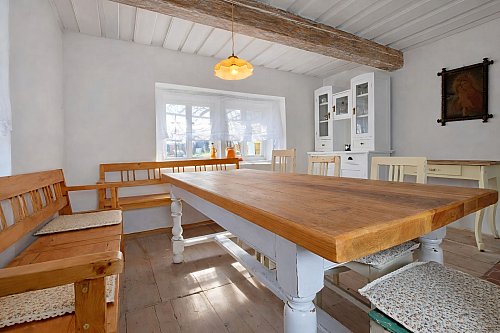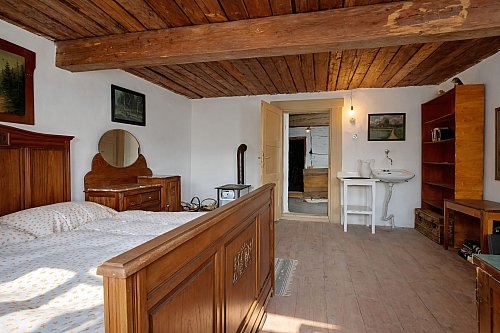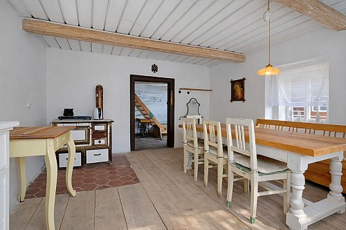 Chalupa si zachovala řadu původních architektonických prvků, které podtrhují její autentický charakter, včetně vzácně dochované původní černé pece. Současná dispozice domu nabízí světnici, koupelnu s toaletou a ložnici v patře. V podkroví se nachází další místnost, která vyžaduje částečnou rekonstrukci. Z půdního prostoru je navíc možné vybudovat další dva pokoje, což poskytuje potenciál pro rozšíření obytné části.