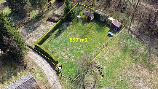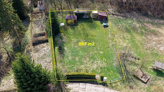 Součástí pozemku je také praktické zázemí: krytá pergola vhodná pro odpočinek, kůlna na nářadí a stavební buňka, která může sloužit jako zázemí během výstavby.